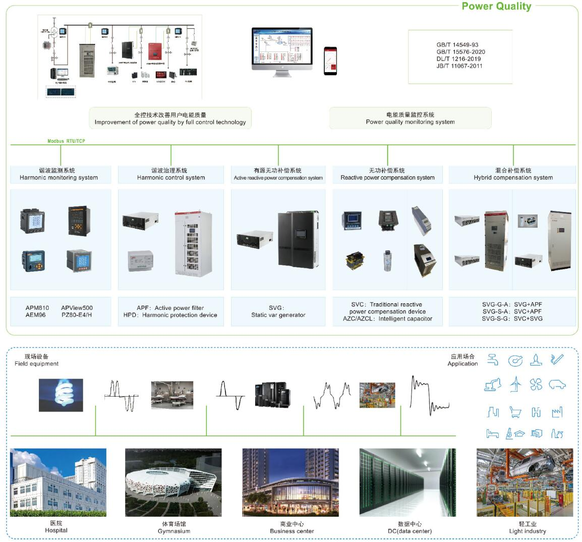 ZHXK-PQmsys電能質量監測系統主要是研究消除供配電系統中的無功補償和諧波治理問題,主要的產品有有源電力濾波器、低壓無功功率補償裝置、靜止無功發生器、混合動態濾波補償裝置、混合動態消諧補償裝置、智慧型動態無功補償裝置、諧波保護器等,適用于新建、改建、擴建和技改項目中工業與民用及公共建筑內電氣設備的無功補償、諧波抑制及綜合治理等,可根據不同行業類型和負載類型的電能質量問題提供合適的設計解決方案,以達到改善供電質量和確保電力系統安全經濟運行的目的。