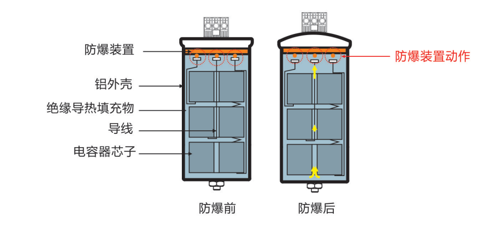 ● 防爆裝置;當電容器內部發生故障,溫度持續升高導致聚丙烯膜自愈能力下降或者損壞,產生氣體壓力,過壓保護裝置會在壓力作用下變形升高,進行防爆泄壓。