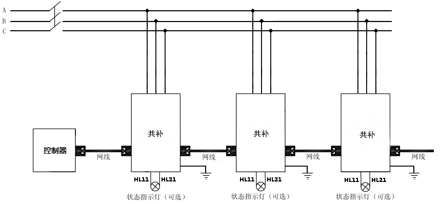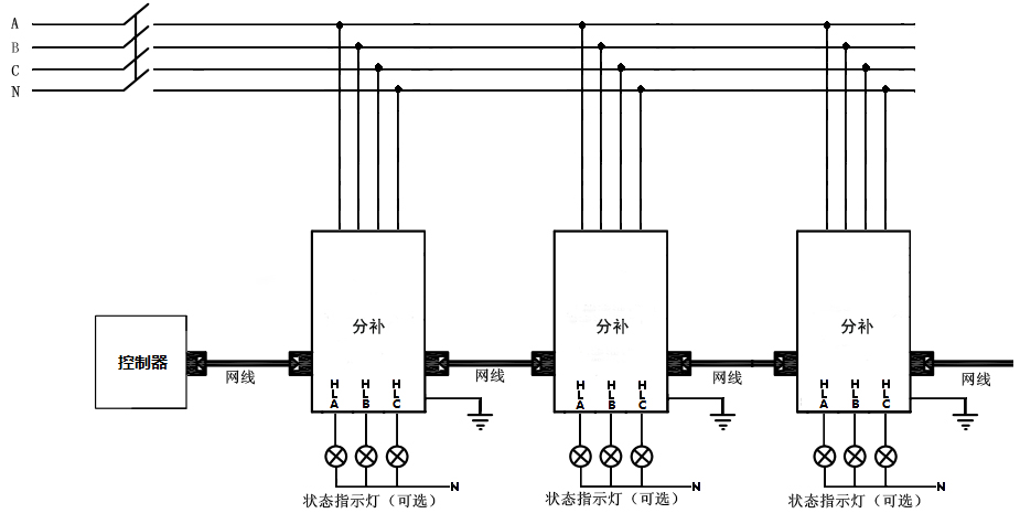 智能組網:485通訊接口,內置 MODBUS-RTU協議;可實現遠程監控。產品可多臺聯機使用時,自動產生主機從機,構成無功自動控制系統。