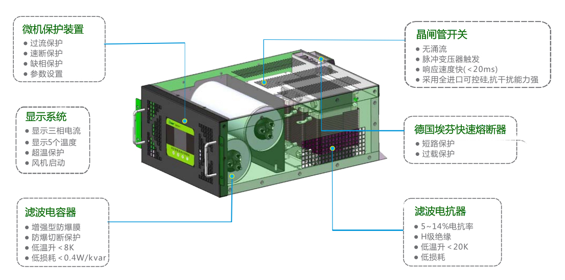 安全可靠:匹配高性能電力電容器和串聯電抗器,體積小、重量輕、高品質、低溫升、低功耗、壽命長,從而保證了整機的安全性和可靠性。