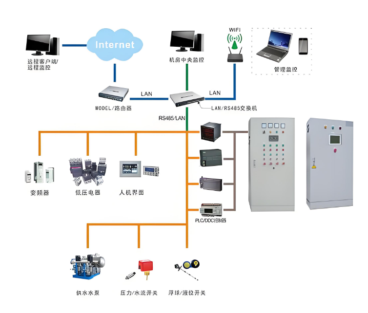 供水設備是為解決由于壓力不足,無法到達用戶用水的高度或流量,而專門研發設計的新型環保節能的專業設備。供水設備可分以下幾種,水箱供水設備,無塔供水設備,消防供水設備,變頻恒壓供水設備,通過該系統可實現對水泵的開停、主排水管路的流量、水泵排水管的壓力、水倉的水位等信號的實時監測,并能通過該系統實現三臺主水泵的自動、手動控制并和PLC監控系統的聯網運營,實現地面監控。